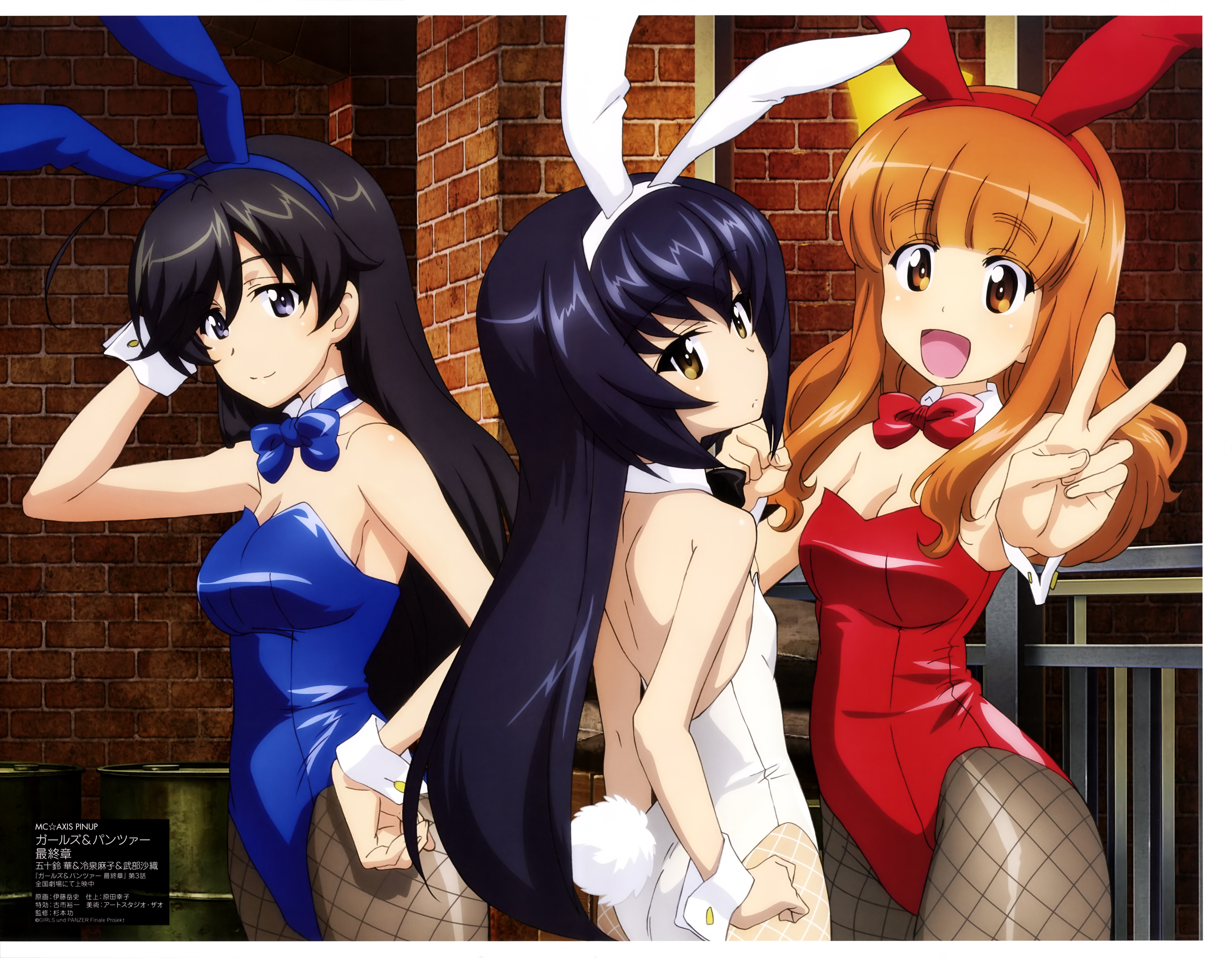 | Tags | 3girls, :d, absurdres, ahoge, animal_ears, artist:itou_takeshi, ass, bare_arms, black_hair, blue_legwear, blue_neckwear, blunt_bangs, booru:gelbooru, bow, bowtie, breasts, brick_wall, brown_eyes, bunny_ears, bunny_girl, character:isuzu_hana, character:reizei_mako, character:takebe_saori, cleavage, closed_mouth, detached_collar, fake_animal_ears, fake_tail, fishnets, grey_eyes, hand_on_own_hip, head_tilt, indoors, leotard, loli, long_hair, medium_breasts, multiple_girls, no_bra, open_mouth, orange_hair, pantyhose, playboy_bunny, rabbit_ears, rabbit_tail, red_bow, red_bowtie, red_leotard, series:girls_und_panzer, series:mc_axis, sideboob, small_breasts, smile, standing, tail, v, white_leotard, wrist_cuffs |