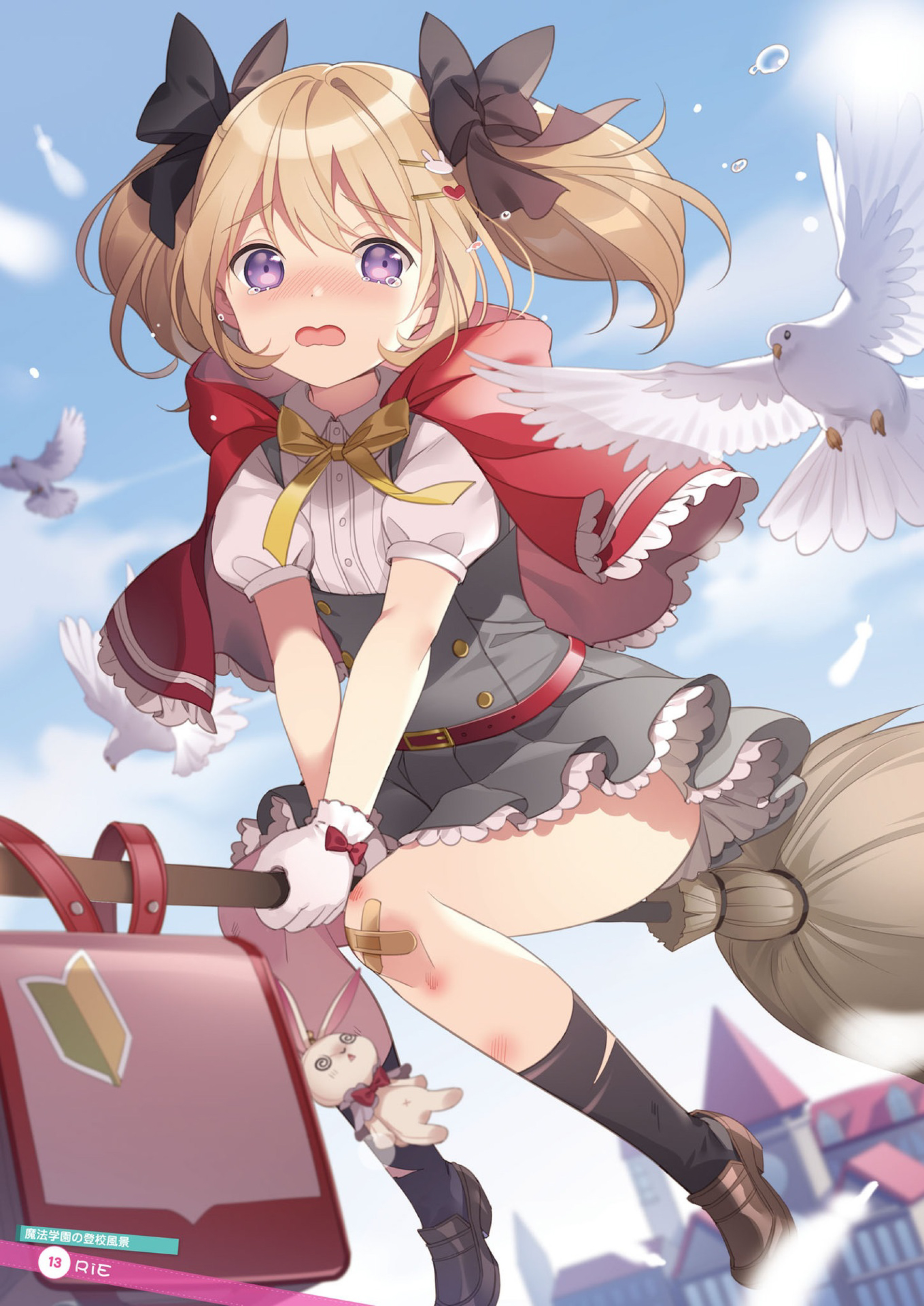 | Tags | 1girl, @_@, animal, artist_name, backpack, bag, bandaid, bandaid_on_knee, bandaid_on_leg, bird, black_bow, black_socks, blue_sky, blurry, blurry_background, blush, booru:gelbooru, bow, broom, broom_riding, brown_footwear, brown_hair, bruise, building, capelet, cloud, collared_shirt, crossed_bandaids, day, depth_of_field, dirty, dirty_clothes, dove, dress_shirt, feathers, gloves, grey_skirt, hair_bow, hair_ornament, hairclip, heart, heart_hair_ornament, high-waist_skirt, highres, holding, hood, hood_down, hooded_capelet, injury, loafers, loli, looking_at_viewer, nose_blush, open_mouth, outdoors, pleated_skirt, puffy_short_sleeves, puffy_sleeves, purple_eyes, rabbit_hair_ornament, randoseru, red_bow, red_capelet, rie, school_uniform, seifuku, series:original, shirt, shoes, short_sleeves, shoshinsha_mark, skirt, sky, socks, solo, stuffed_animal, stuffed_rabbit, stuffed_toy, suspender_skirt, suspenders, tears, torn_clothes, torn_socks, twintails, wavy_mouth, white_feathers, white_gloves, white_shirt, yellow_bow |